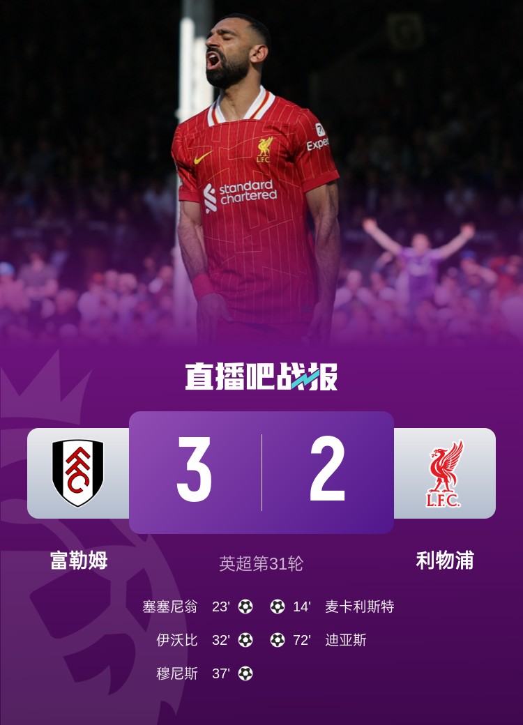 利物浦本輪3-2不敵富勒姆,利物浦后防集體夢游,球隊也吃到了英超賽季第二敗。
