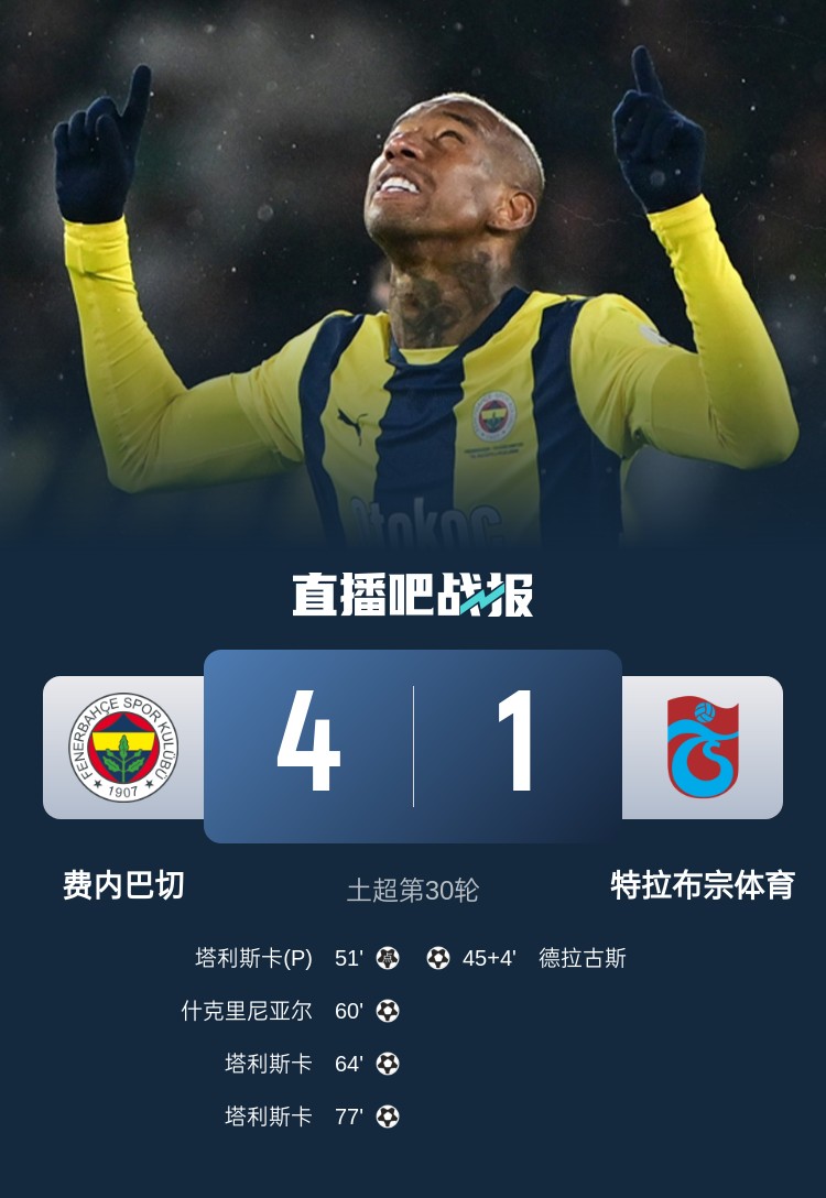 費內巴切本輪4-1擊敗特拉布宗體育,塔利斯卡戴帽,費內巴切距榜首3分。
