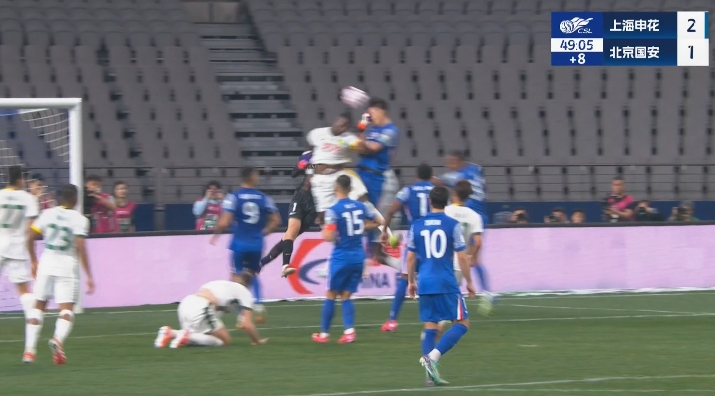 上一輪申花vs國安上半場補時階段,申花前場任意球,韓佳奇出擊稍慢一步,拳擊蔣圣龍面部。