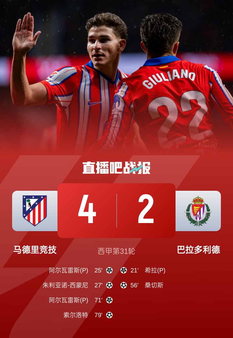 馬競4-2逆轉巴拉多利德,阿爾瓦雷斯兩球,朱利亞諾-西蒙尼和索爾洛特破門。