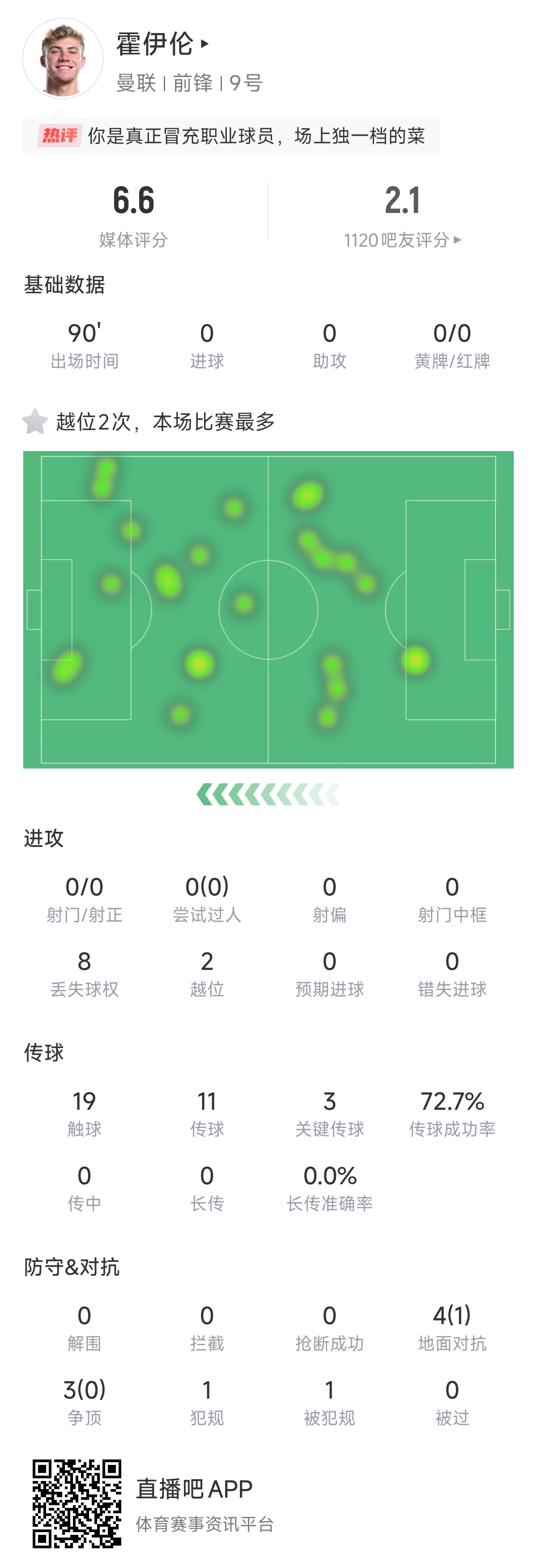 6000萬身價怕是要掉了…22歲霍伊倫熱點圖遍布全場但0射0正2越位?