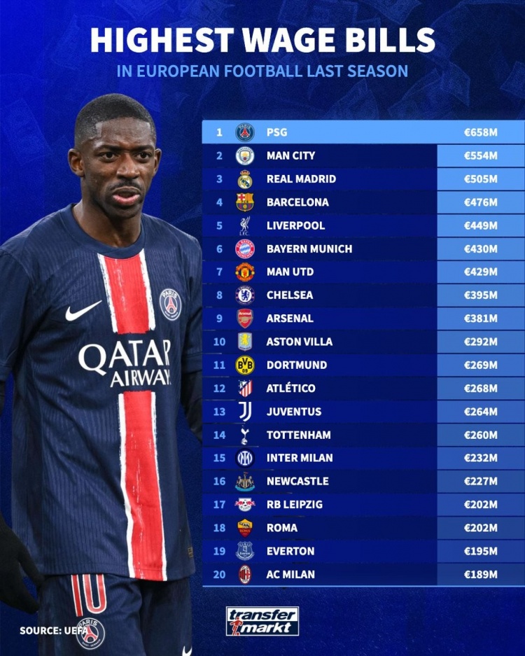 3月7日訊 歐足聯不久前公布了各俱樂部上賽季薪資情況,《轉會市場》也就此列出了榜單,巴黎居首。