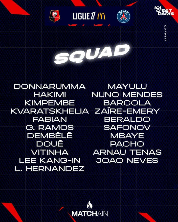 3月8日訊 北京時間明天凌晨0點,巴黎圣日耳曼將在法甲第25輪客場挑戰雷恩,球隊今天公布了大名單。