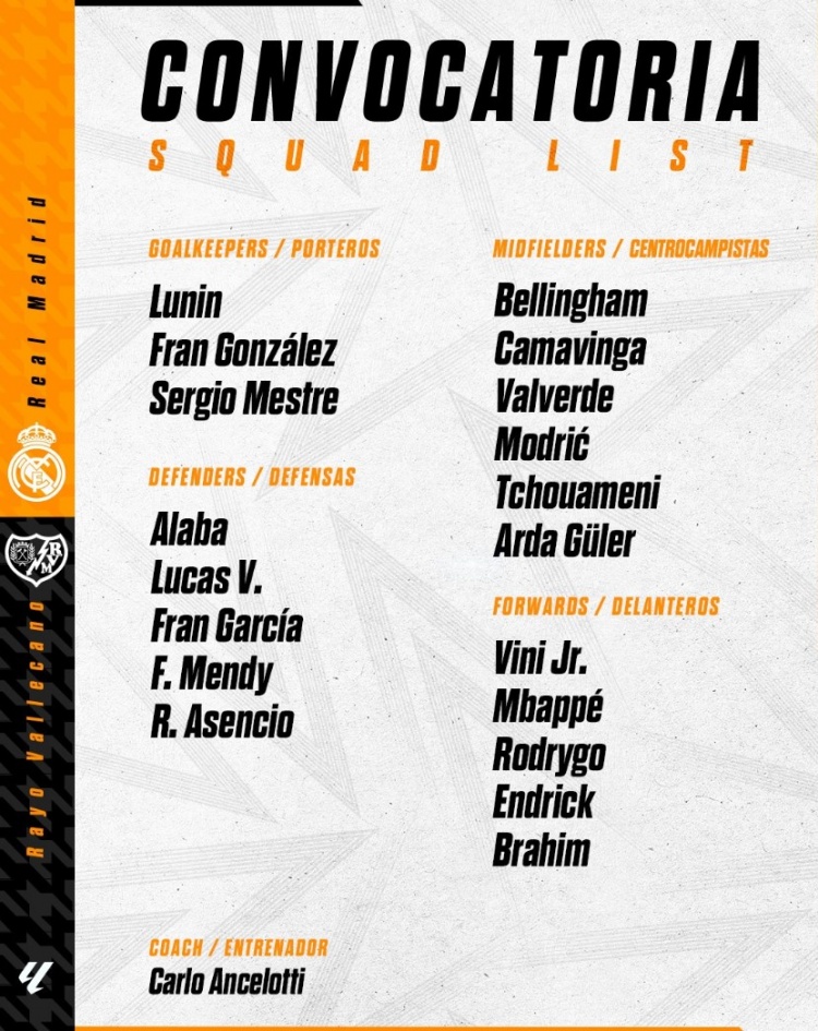 皇馬對陣巴列卡諾大名單:庫爾圖瓦缺席,姆巴佩&巴爾韋德在列?