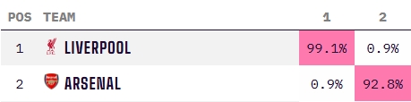 利物浦:99.1%;阿森納:0.9%