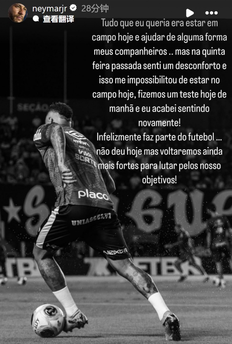3月10日訊 今天,桑托斯在巴西錦標半決賽的比賽中1-2不敵科林蒂安,內馬爾在社媒發文說明了他未能登場的原因。