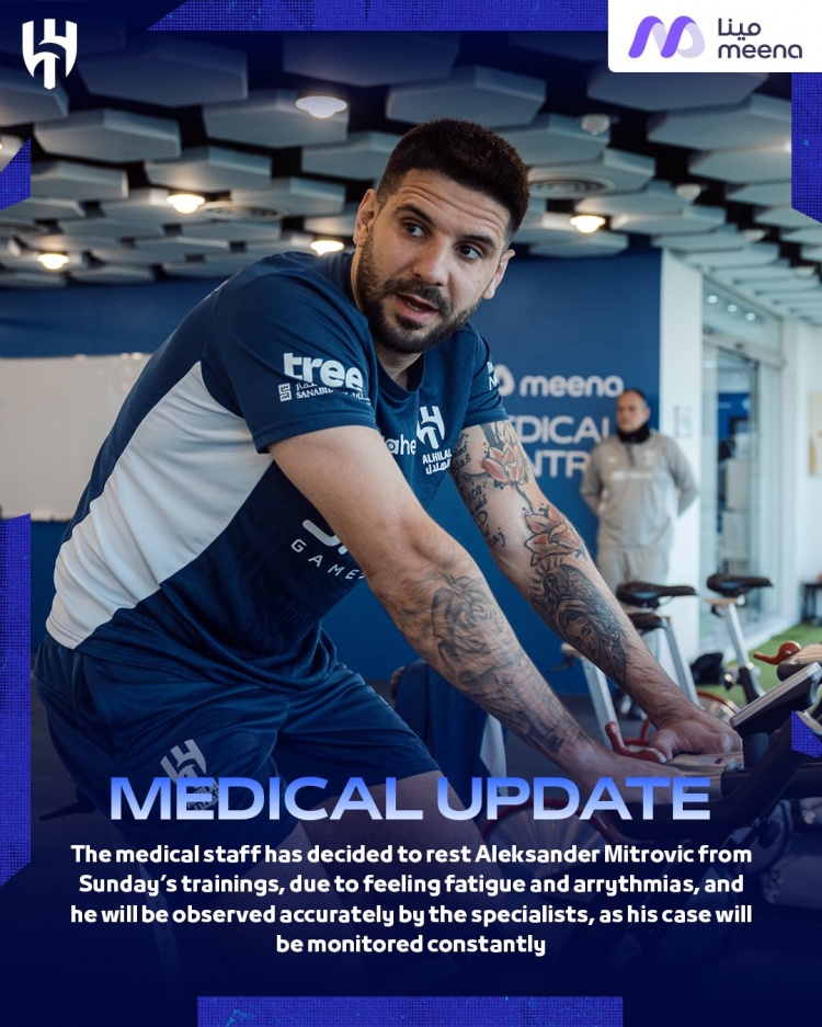 利雅得新月官方寫道:“由于感到疲勞和心律不齊,醫務人員決定讓米特洛維奇在周日的訓練中休息,專家將對他進行精確觀察,他的情況會得到持續檢測。”