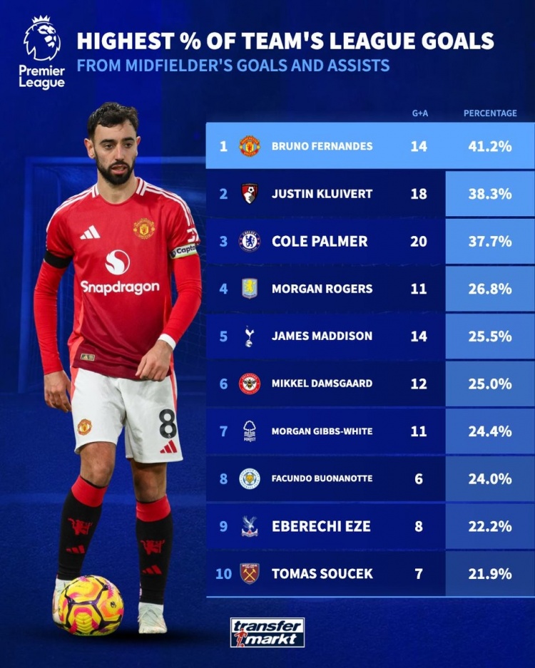 3月10日訊 《轉會市場》統計了本賽季英超中場球員參與全隊聯賽總進球的比率,B費獨占榜首。