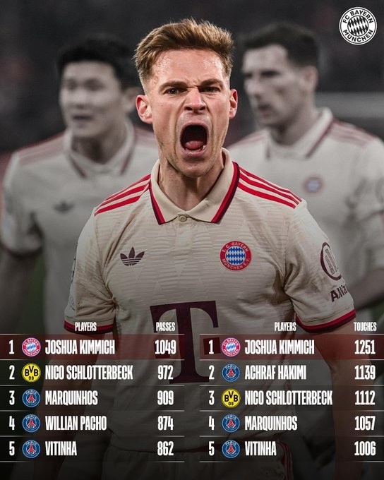 兩項第一!基米希在本賽季歐冠傳球數和觸球數兩項數據均位居榜首?