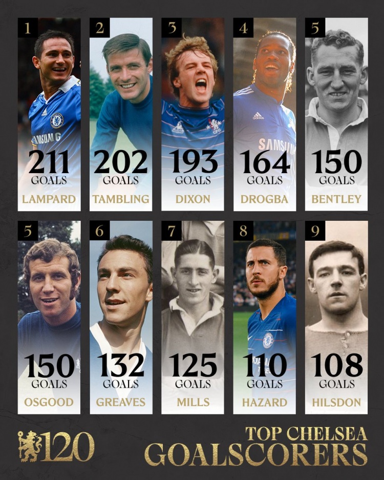 3月11日訊 切爾西俱樂部成立120周年,俱樂部官方社媒曬出了截至目前隊史射手榜,蘭帕德211球居首。