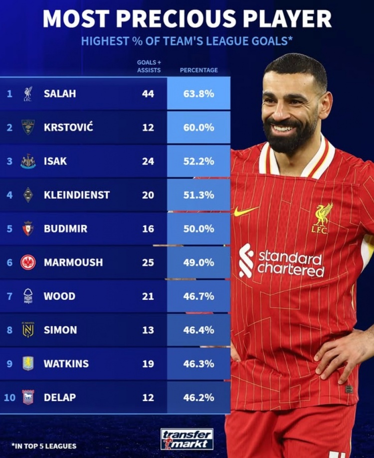 3月11日訊 《轉會市場》統計了本賽季五大聯賽直接參與進球占全隊總進球的比率情況,薩拉赫無懸念居首,已經轉會曼城的馬爾穆什依然是法蘭克福隊內最高。