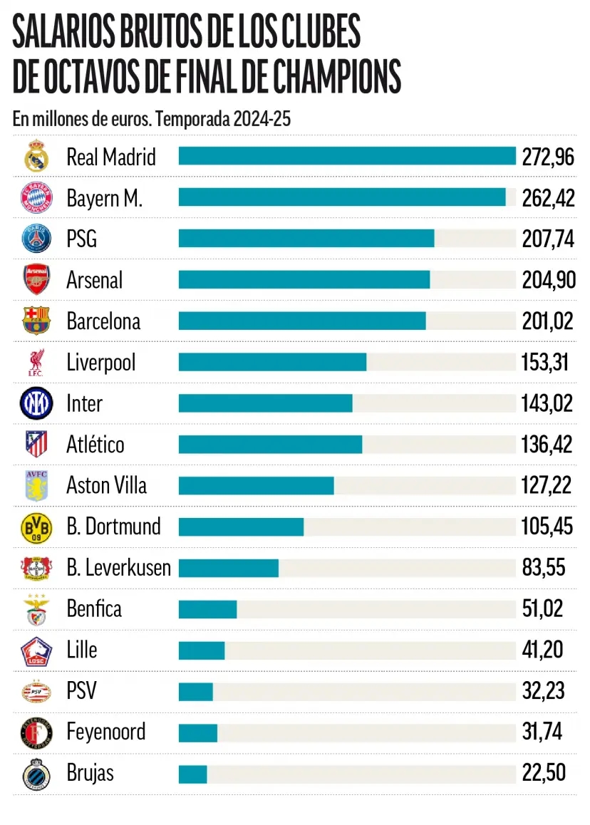 有五家俱樂部的薪資超過2億歐元(皇馬、拜仁、巴黎、阿森納和巴薩),而四家低于5000萬歐元(埃因霍溫、費(fèi)耶諾德、布魯日和里爾)。今天和明天,這些低薪球隊中會否有黑馬殺入四強(qiáng)呢?