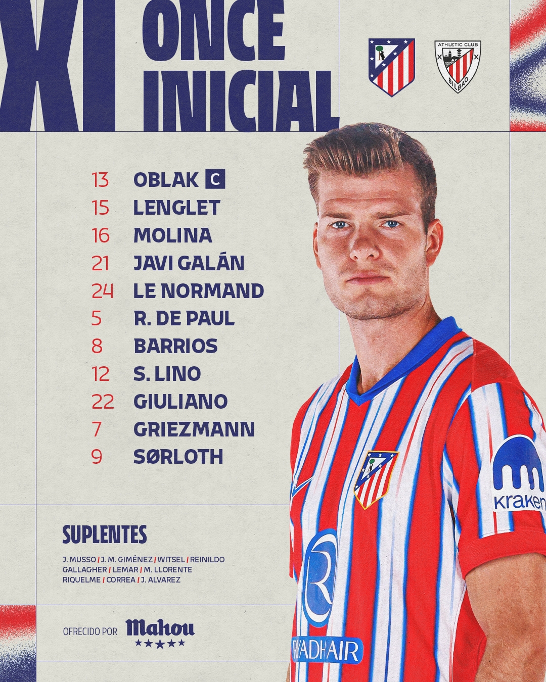 馬競首發:13-奧布拉克、15-朗格萊、16-莫利納、21-加蘭、24-勒諾爾芒、5-德保羅、8-巴勃羅-巴里奧斯、12-利諾、22朱利亞諾-西蒙尼、7-格列茲曼、9-索爾洛特