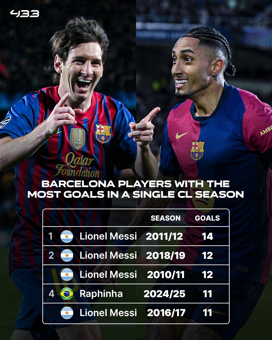 巴薩隊(duì)史個(gè)人單賽季進(jìn)球紀(jì)錄中,拉菲尼亞本賽季11球進(jìn)入前五,其余四席均是梅西。