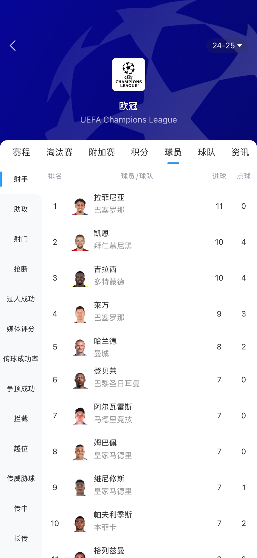 本賽季歐冠射手榜↓