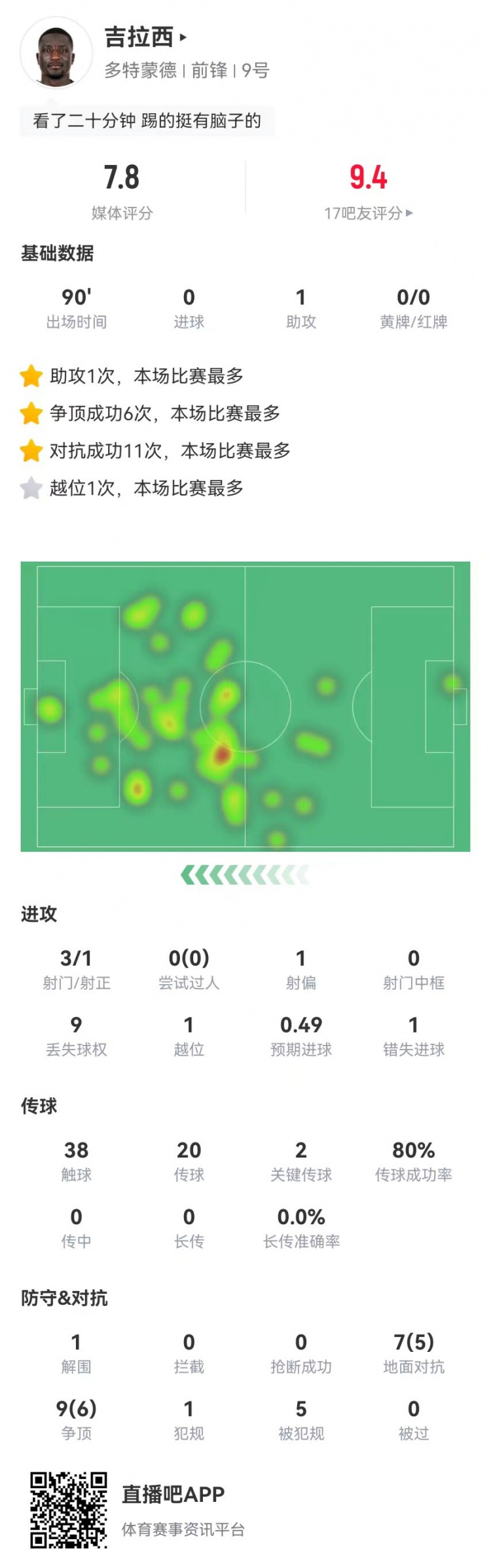 3月13日訊 多特在本輪歐冠2-1擊敗里爾,吉拉西本場數據如下: