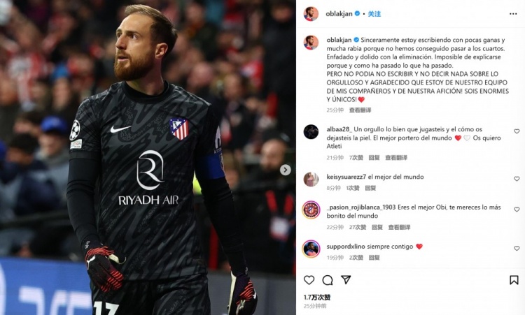 3月13日訊 馬競在本輪歐冠主場被皇馬點球淘汰,門將奧布拉克在不久前通過社媒發文。