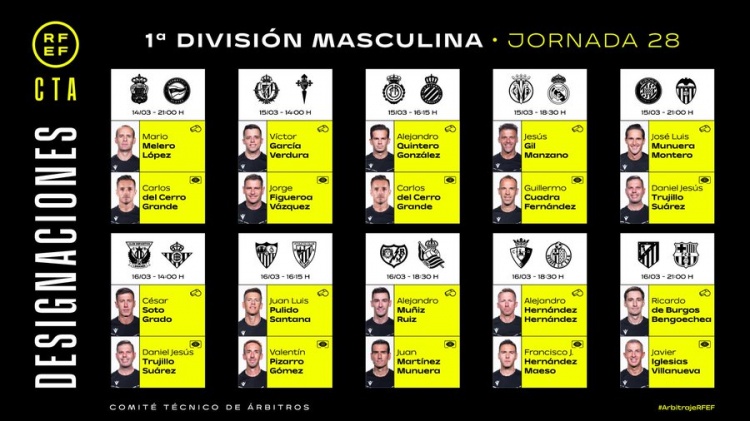 3月13日訊 西甲第28輪聯賽各場執法裁判公布,曼薩諾執法比利亞雷亞爾vs皇馬,本戈切亞執法馬競vs巴薩。